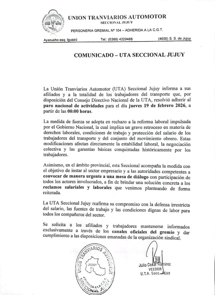 La Unión Tranviarios Automotor (UTA) Seccional Jujuy informó que adherirá al paro nacional de actividades convocado por el Consejo Directivo Nacional del gremio para el jueves 19 de febrero de 2026, a partir de las 00:00 horas. La medida alcanzará a la totalidad de los trabajadores del transporte nucleados en la organización sindical.